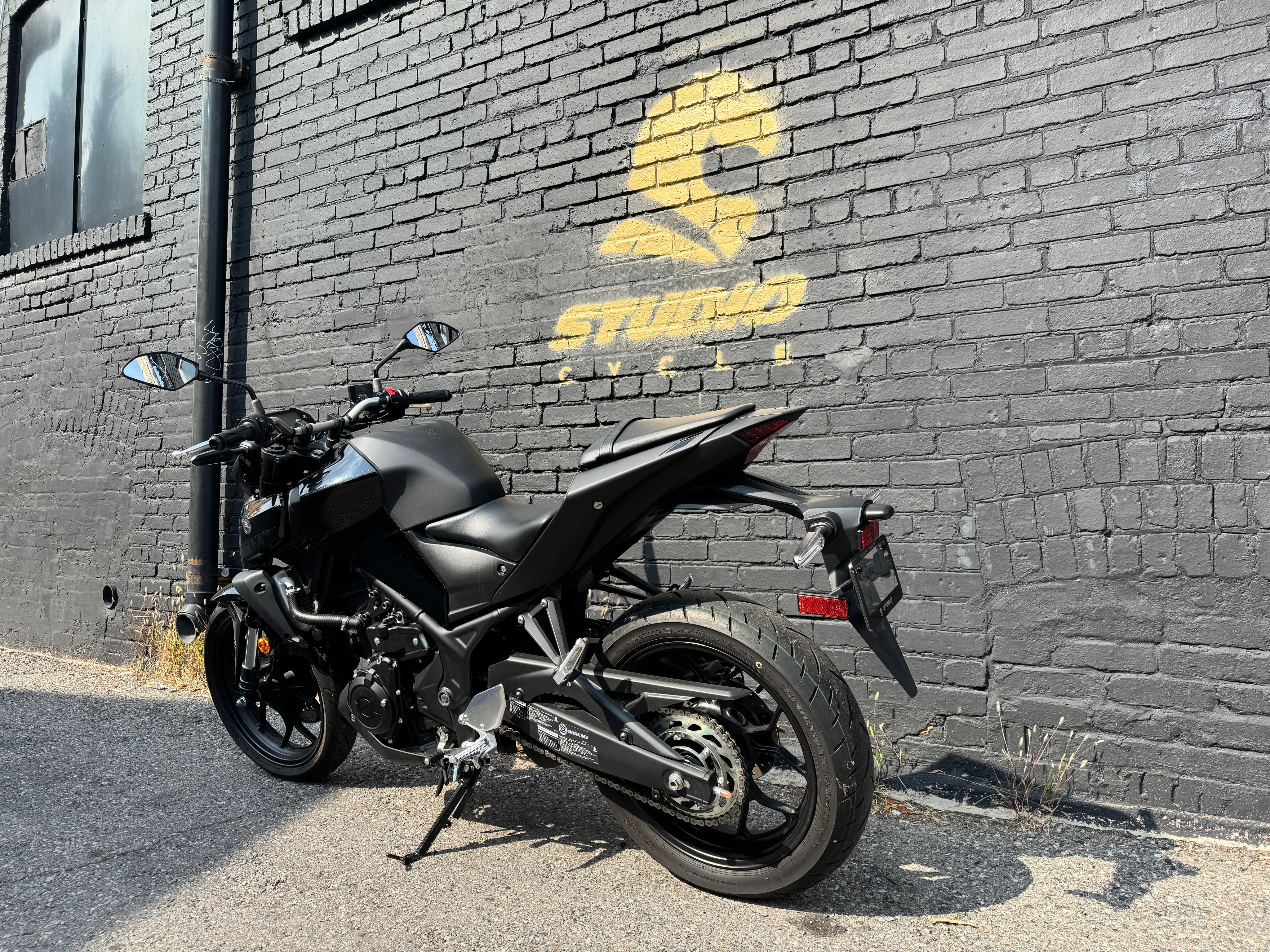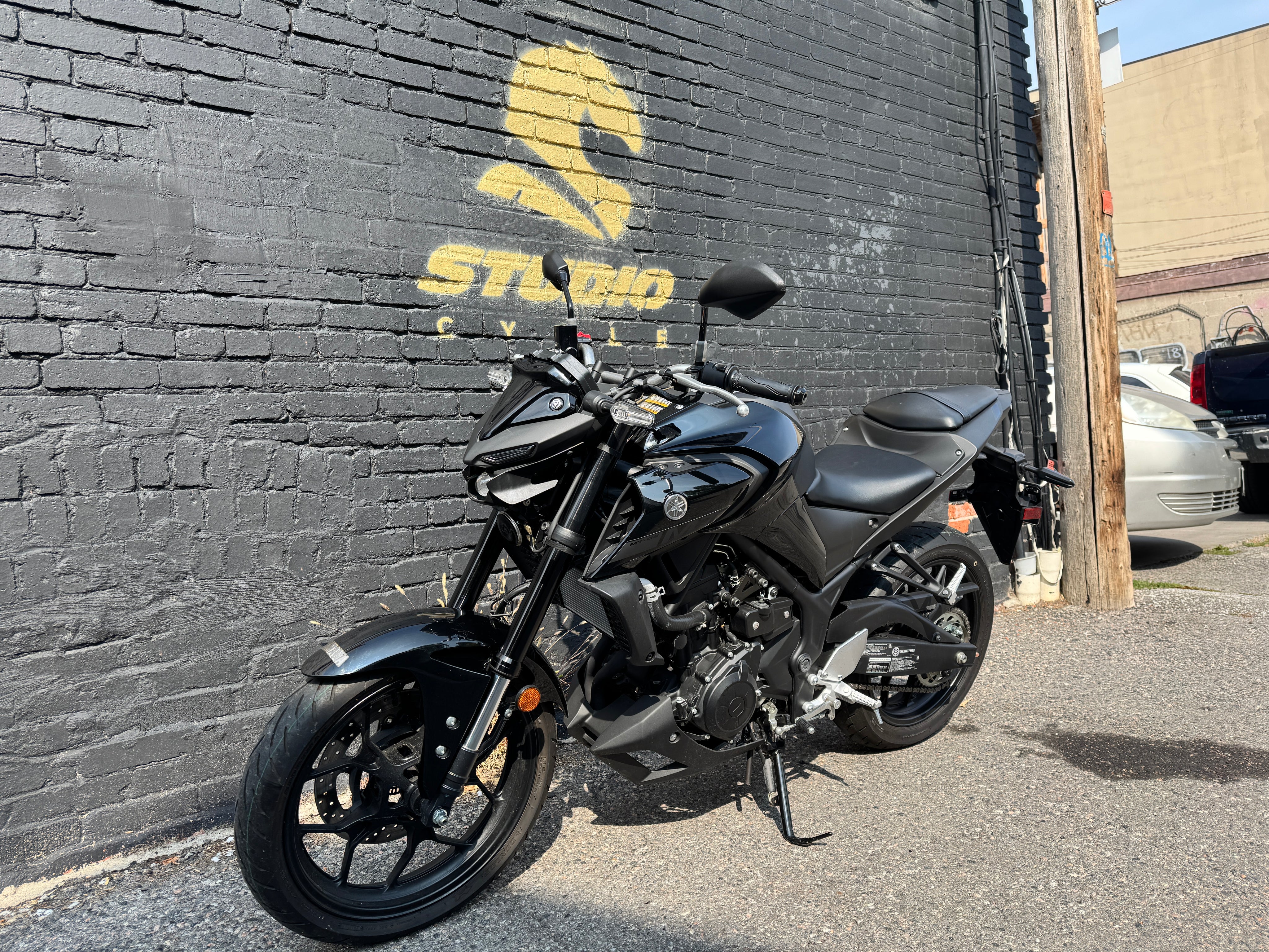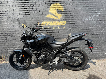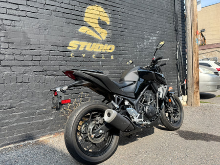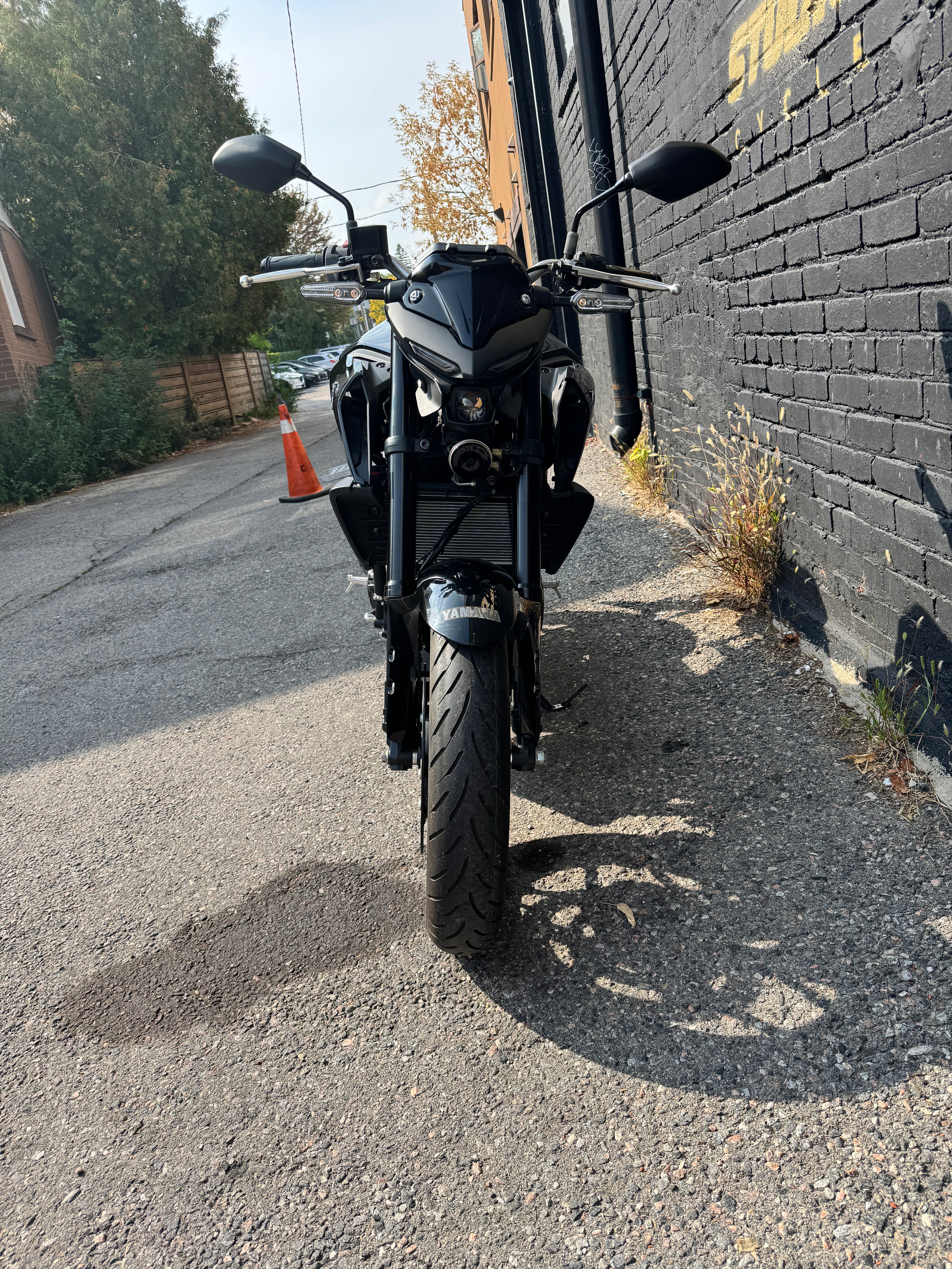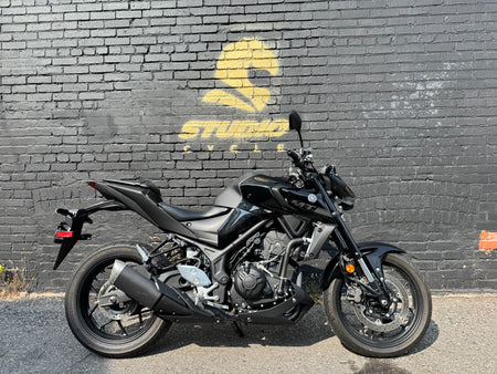 The MT-03 takes after its larger siblings with taller handlebars, bar-mounted mirrors, and LED lighting, as well as unique bodywork that includes a wide-shouldered fuel tank with lightweight air scoops. This is a hyper naked in a compact package.