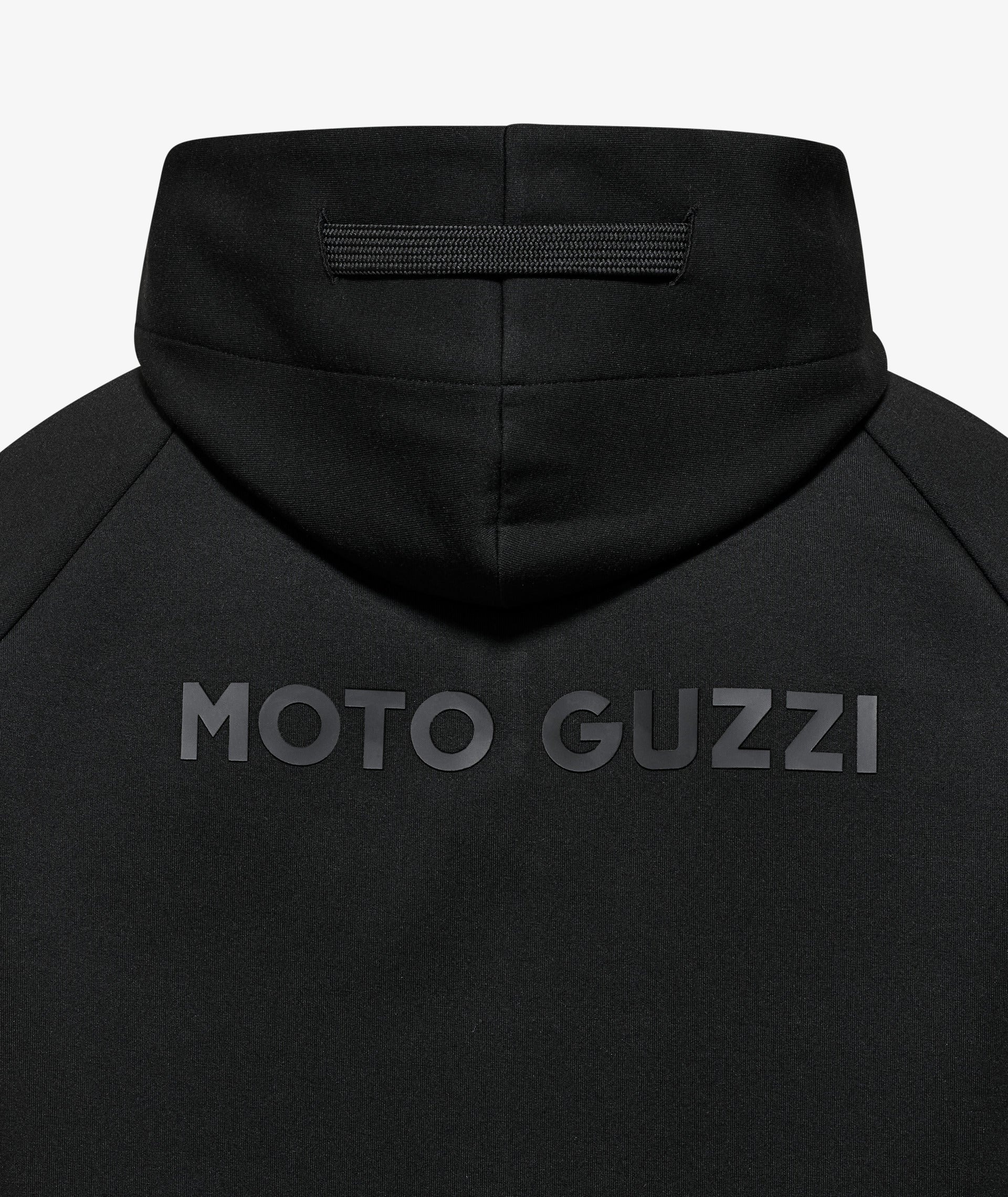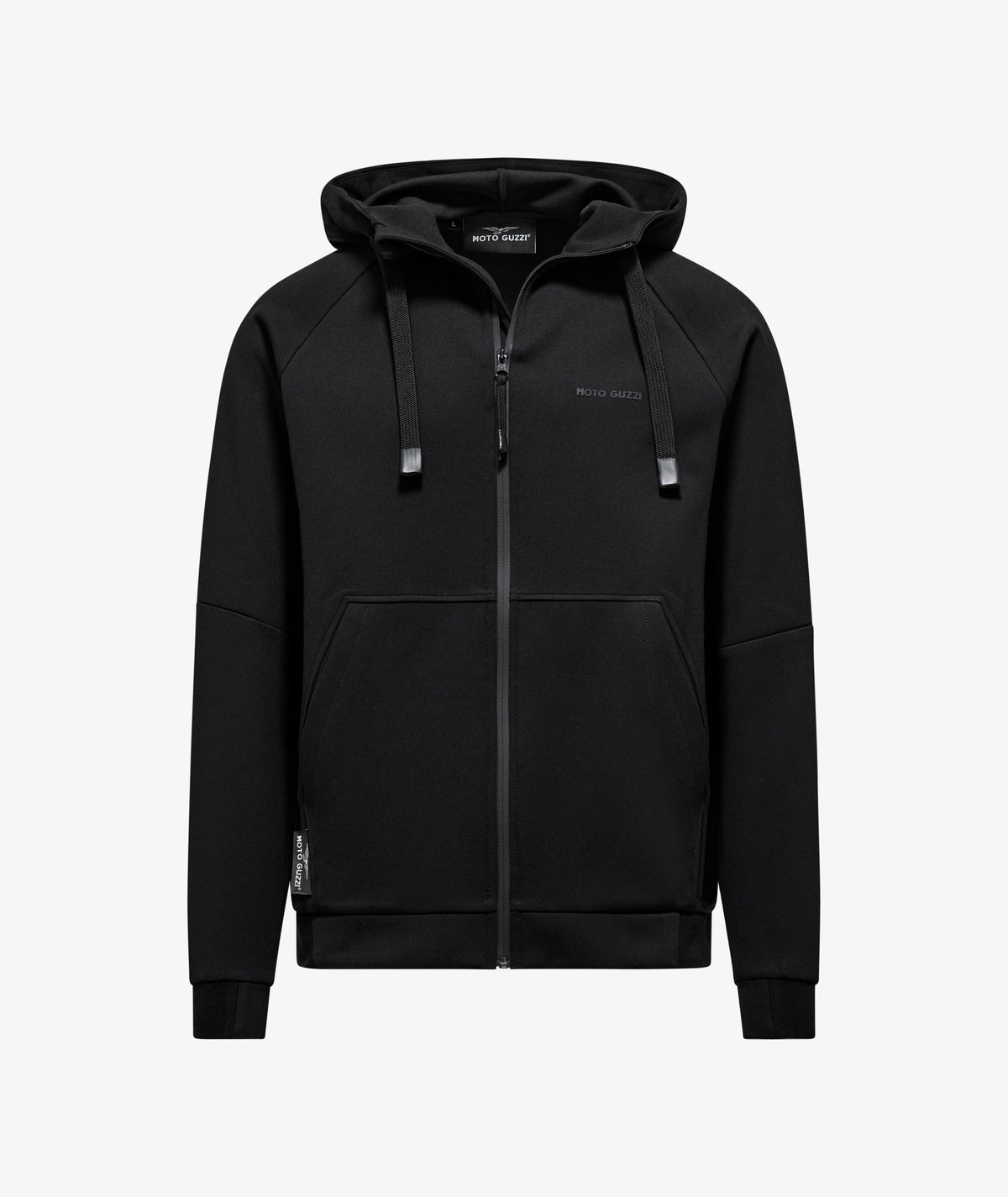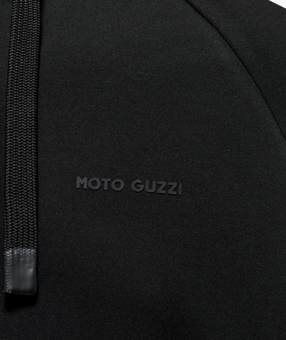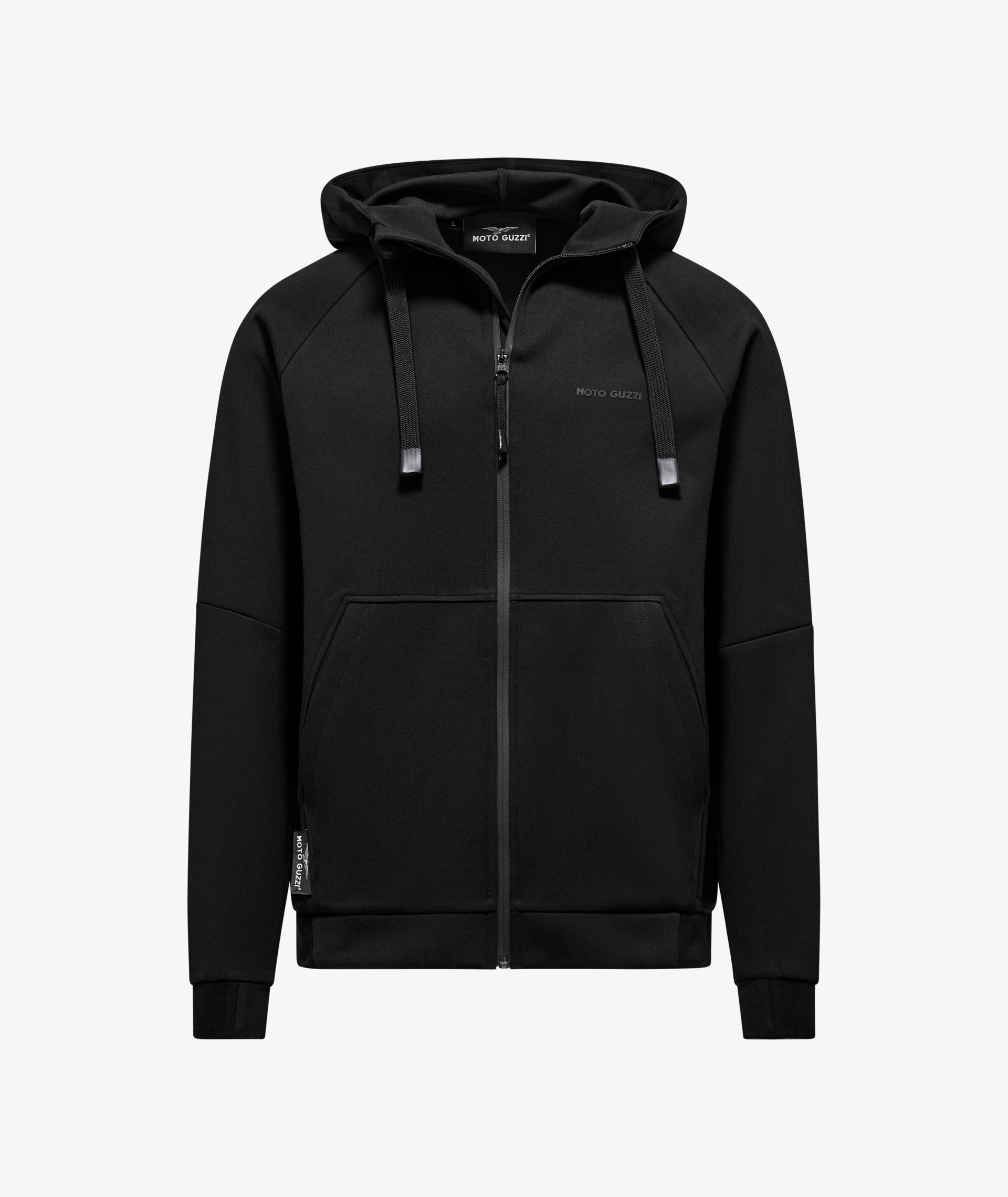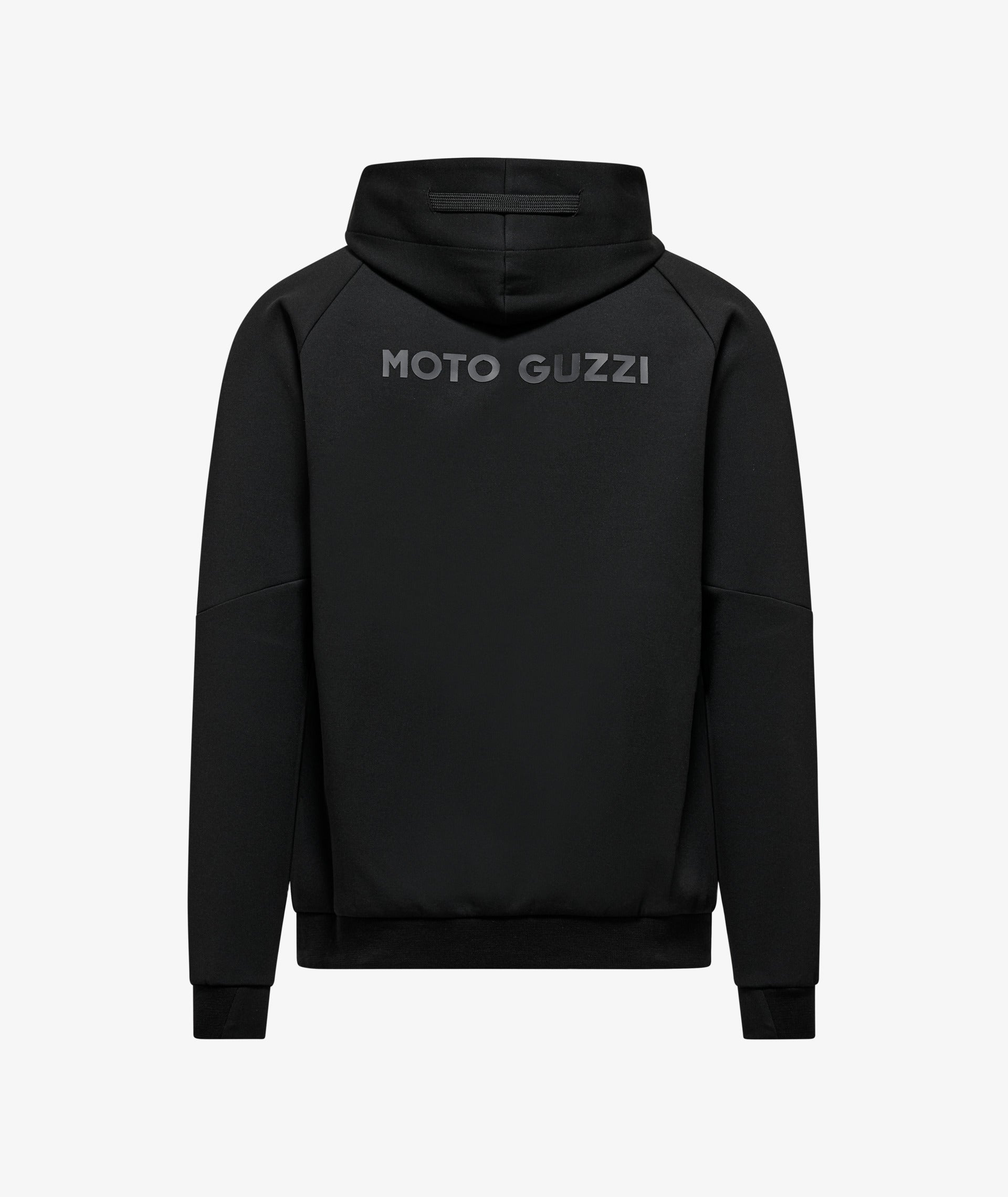 Scuba fabric sweatshirt with rubberized MOTO GUZZI print on the chest and back. Featuring an adjustable hood, full-length zipper, and kangaroo pockets. Raglan sleeves, a sporty reinterpretation of a men's clothing classic. The MOTO GUZZI woven label sewn on the side adds a distinctive touch, while the contrast double fabric cuffs and hem ensure style and comfort.