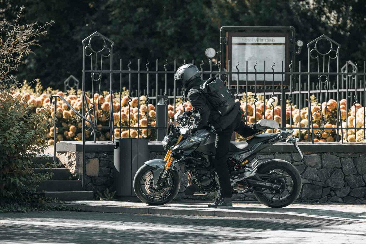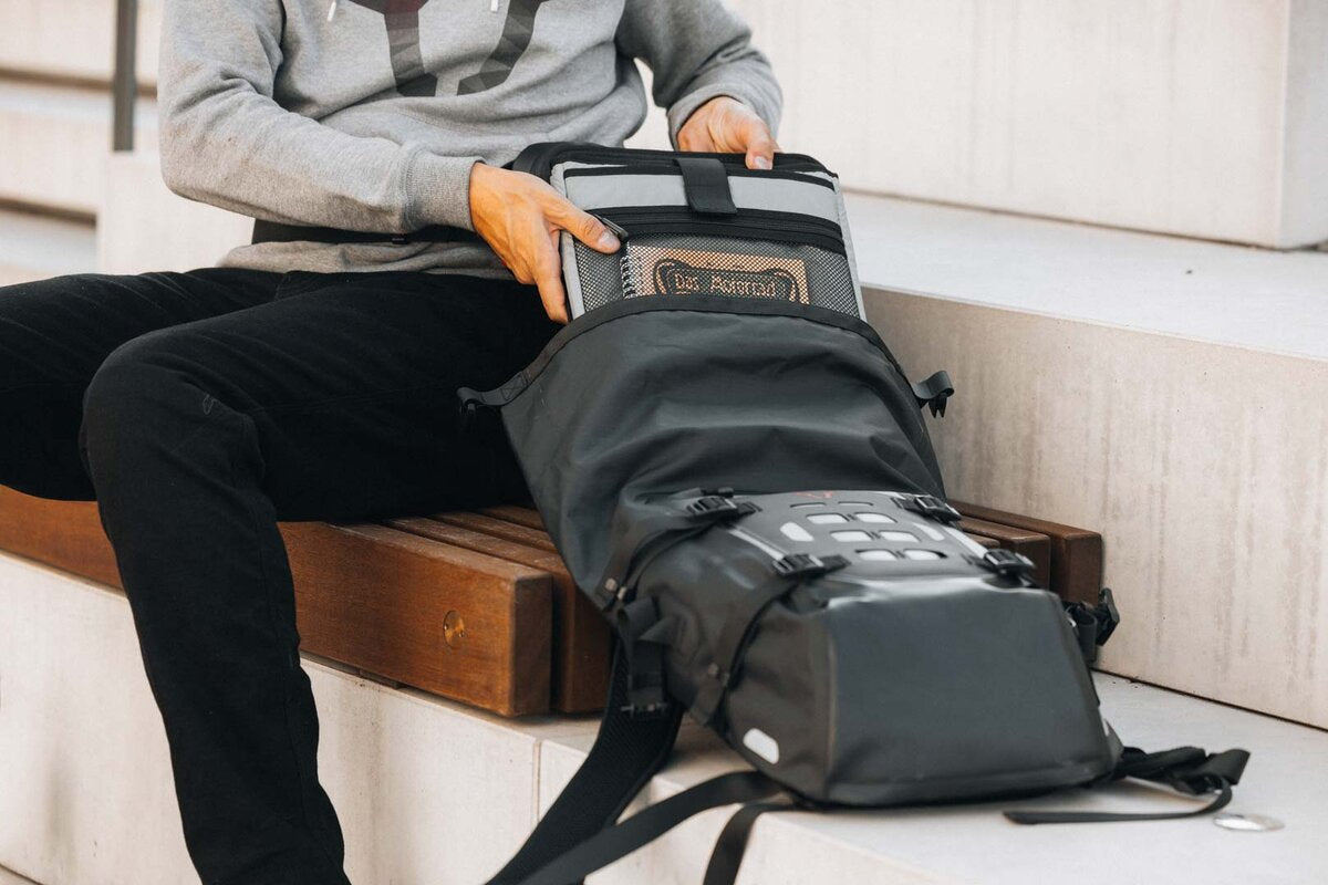 With the Daily WP, we have developed a high-quality motorcycle backpack that can meet all the challenges of everyday motorcycling. Its practical features ensure that your belongings are transported safely, comfortably, and dry. Perfect for commuting or long weekend trips. The waterproof main compartment with roll-top closure offers 22 liters of storage space, and thanks to the robust TPU material, your belongings remain protected even in heavy rain. You can easily store a 15-inch notebook and a tablet in the removable laptop compartment. The spacious front pocket with integrated key attachment offers plenty of space for smaller items. The padded carrying straps are adjustable in length, while the removable hip belt and the ergonomically shaped back padding ensure a high level of comfort. Thanks to a magnetic click closure, the chest strap can be operated even with the helmet visor closed. With the compression straps on the front, you can ensure that the Daily WP always sits firmly on your body, even with little load. Reflective details improve your visibility in low-light conditions.